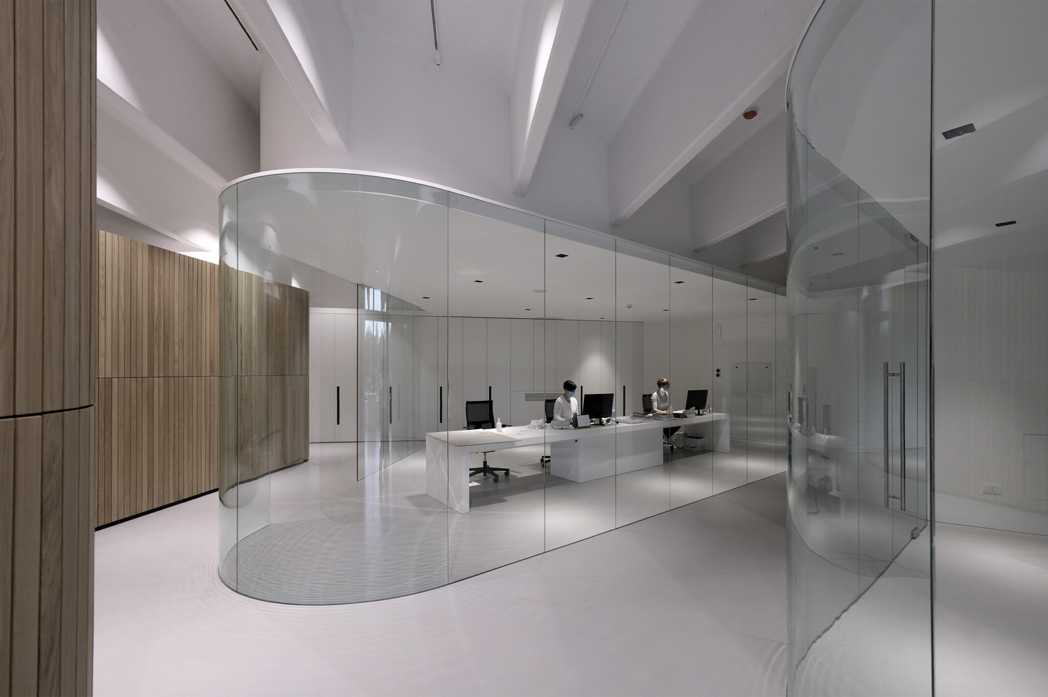 La valorizzazione delle ampiezze viene raggiunta grazie a pareti monolitiche speciali, incassate a pavimento ed ancorate ad un profilo superiore realizzato in cartongesso e vetri temperati stratificati sia per le parti rettilinee, che per quelle sagomate ad arco. Sono state installate porte in cristallo temperato, prive di cassaporta, a trasparenza massima con cerniere a bilico e maniglione in acciaio inox che aumentano la percezione dello spazio.